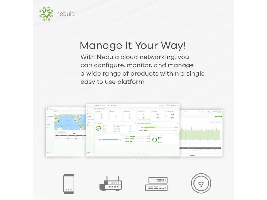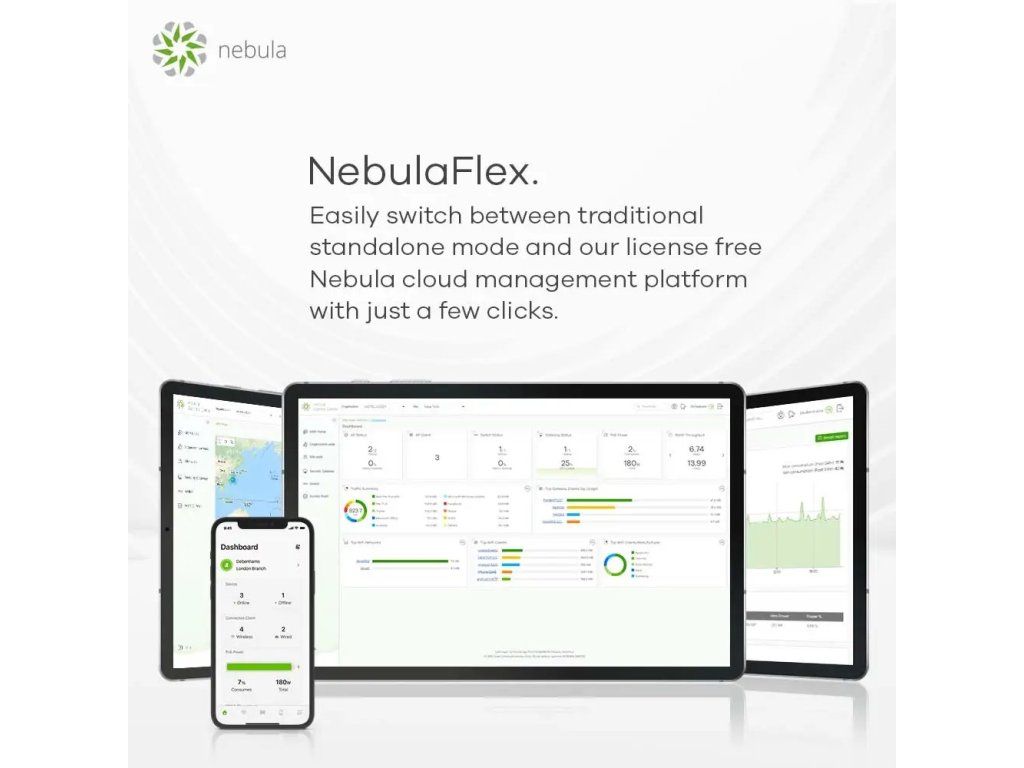 Model NWA55AXE je kompatibilní s řešením NebulaFlex, takže můžete libovolně přepínat mezi jeho lokální správou prostřednictvím grafického uživatelského rozhraní a extrémně snadnou správou pomocí intuitivní cloudové platformy Nebula, se kterou si nemusíte pamatovat IP adresu, uživatelské jméno ani heslo.