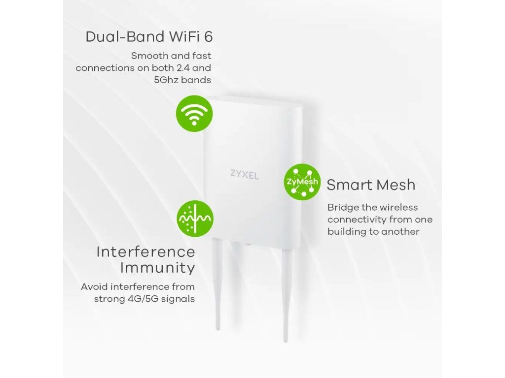 Přístupový bod NWA55AXE má technologii ZyXEL Smart Mesh, která kvůli lepšímu dosahu signálu vytváří dynamické bezdrátové propojení mezi přístupovými body a navíc zajišťuje bezdrátovou konektivitu z jedné budovy do druhé. Přístupový bod NWA55AXE je ideálním řešením pro všechny, kdo chtějí snadno rozšířit svou venkovní bezdrátovou síť nebo vytvořit propojenou bezdrátovou síť mezi budovami.